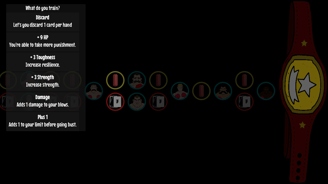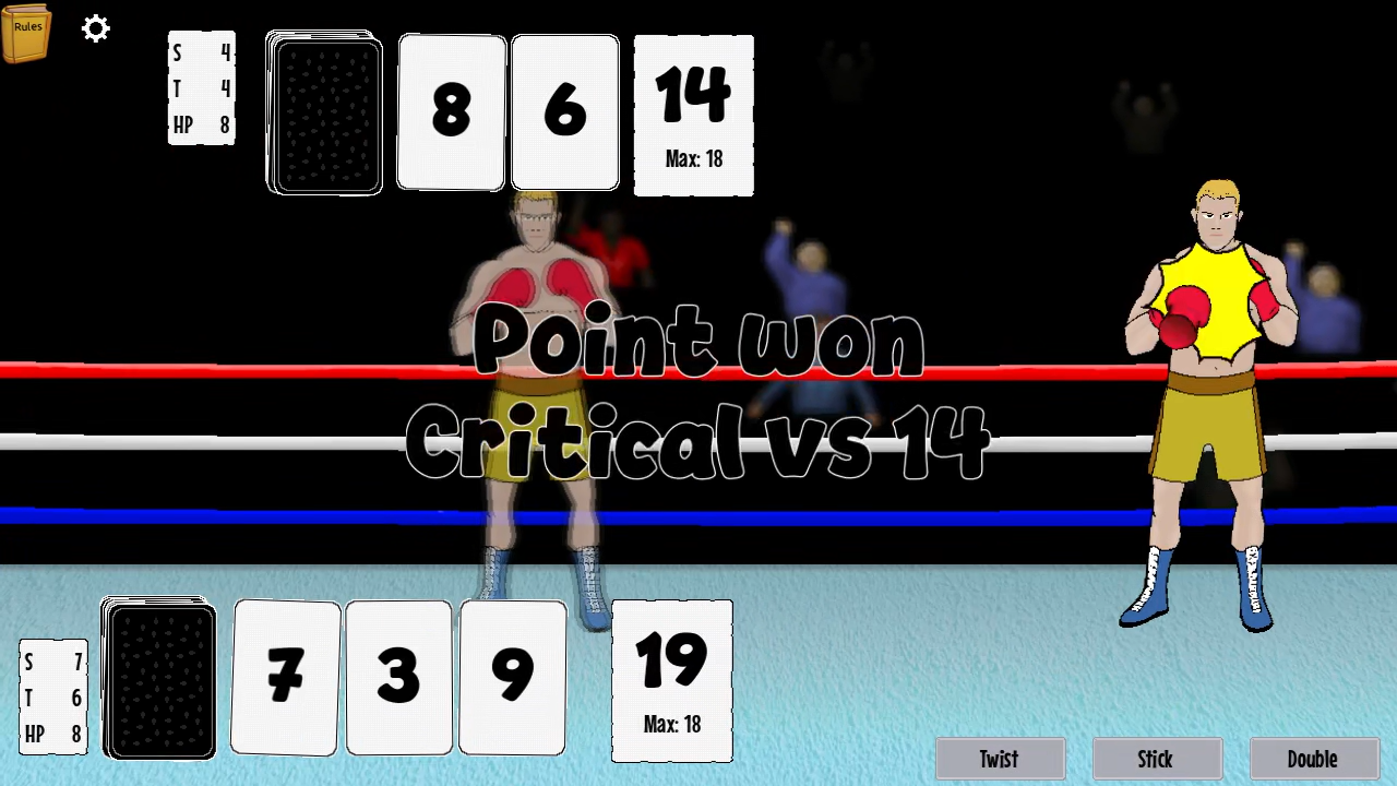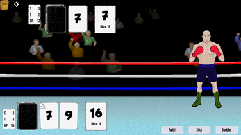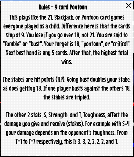 Open the rule book. It's basically pontoon, with power-ups/buffs, and custom decks if you make it that far. Truth be told, I didn't get around to implementing card powerups, only personal stat boosts, and deck modifications. I had plans to make some of the gains appear on cards, but alas the deck is left pretty much unaltered.