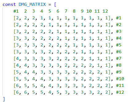 Your strength determines your row, opponent's toughness is the column, the grid content is the damage.